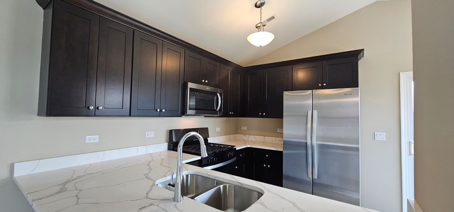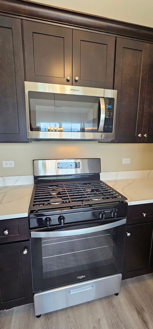 Expresso cabinets with soft closed doors and drawers throughout the home including stainless steel appliances.